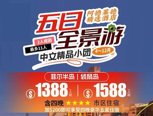 XL 南澳5日全景游中文精品小团 -阿德莱德市区+穆理河+袋鼠岛/菲尔半岛+巴罗莎谷 +奔富/粉红